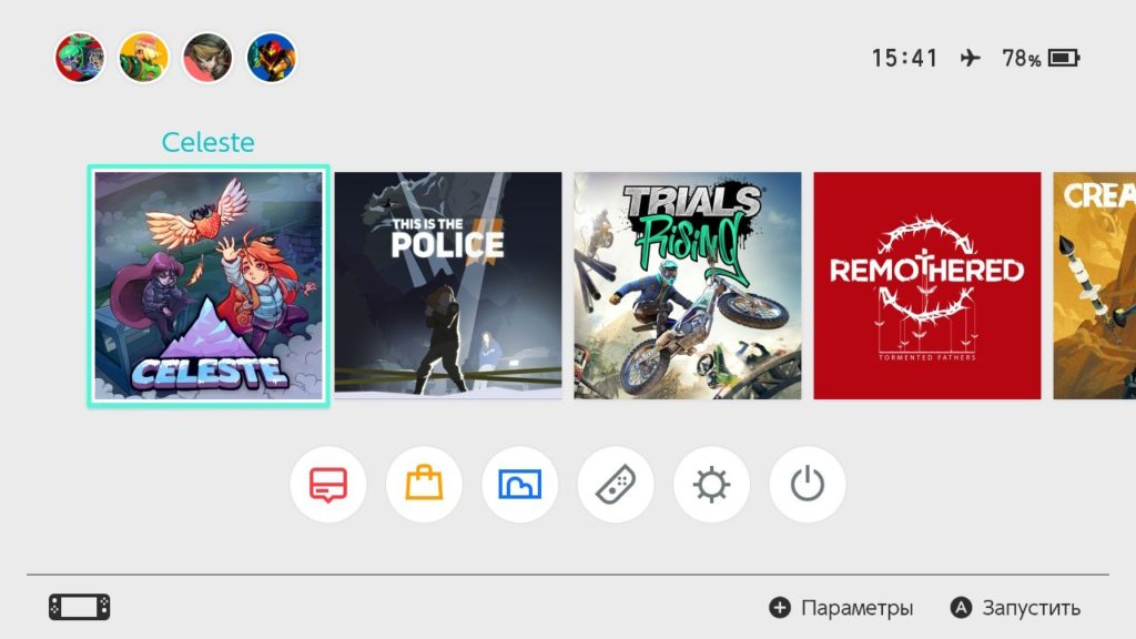 Чуть ниже расположились цветные иконки: новости, магазин eShop, альбом, контроллеры, системные настройки и питание.